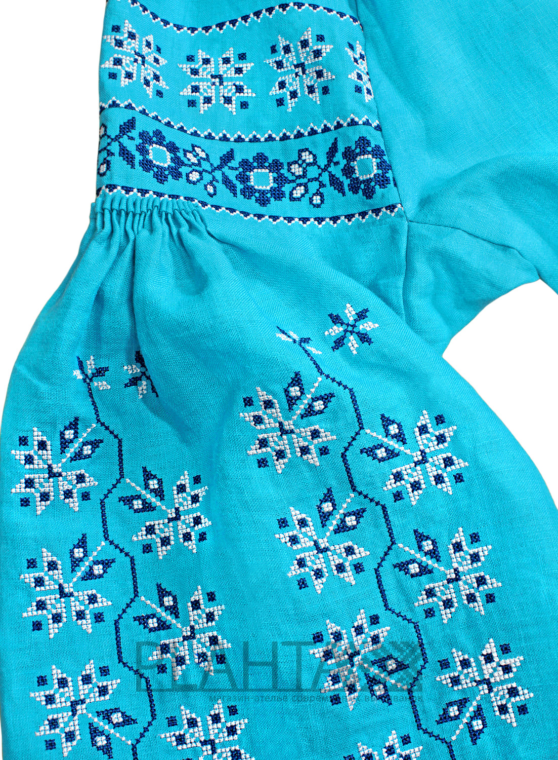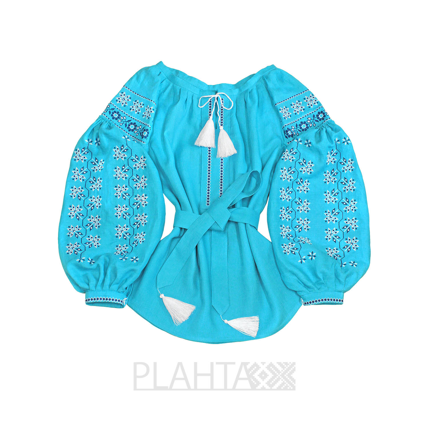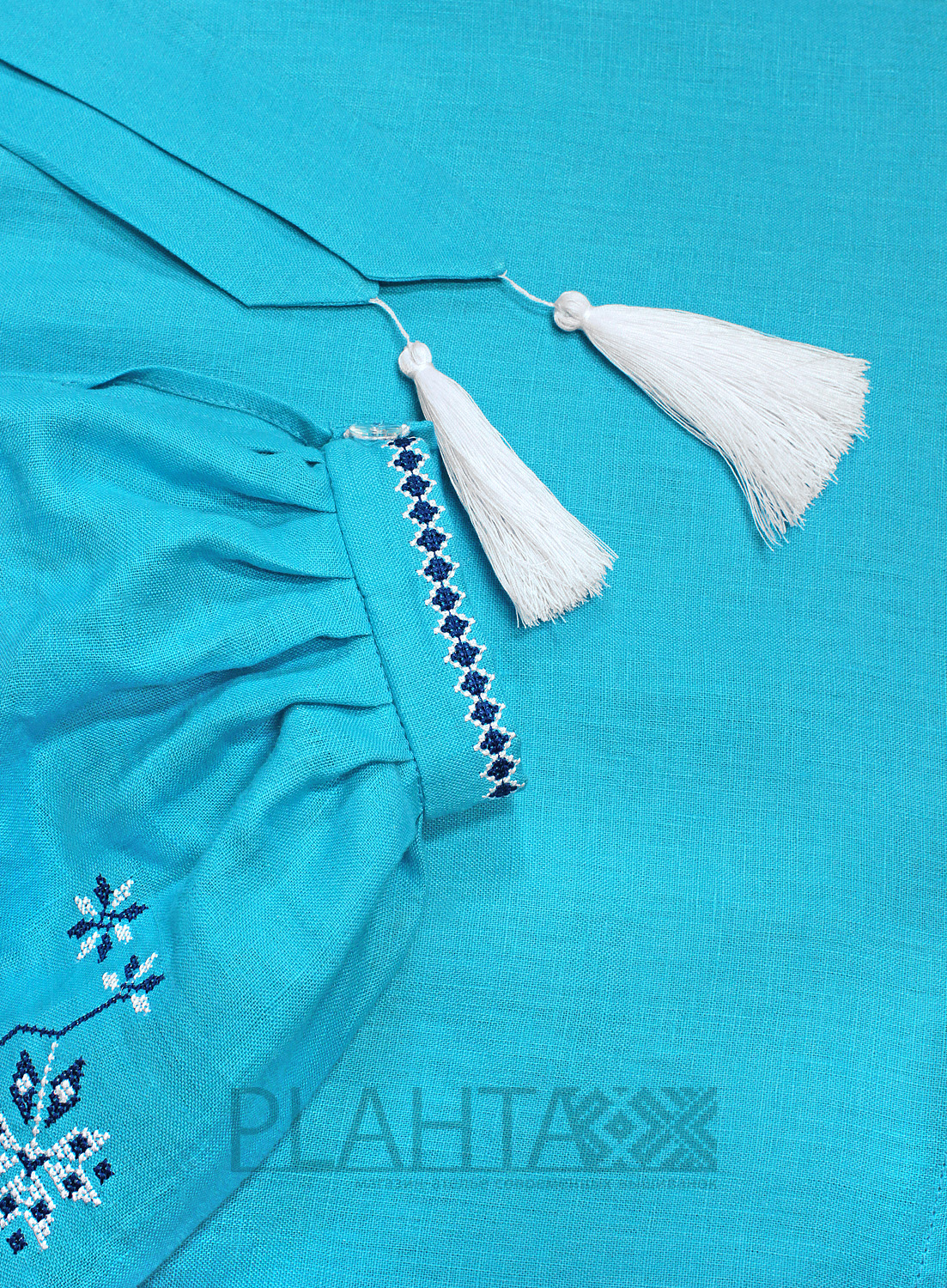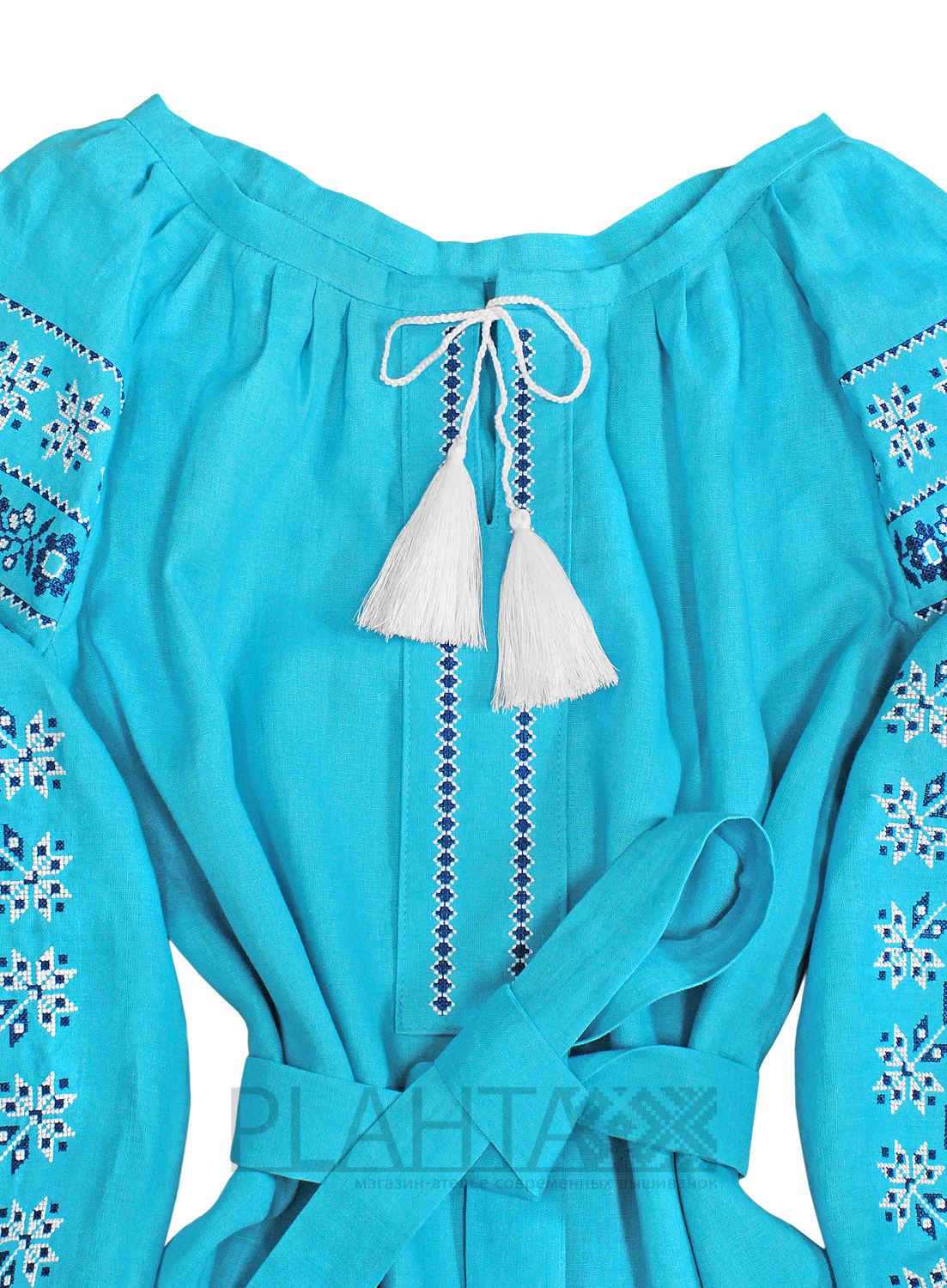 Ясний лазуровий колір тканини в поєднанні з ніжною вишивкою створюють в сумі елегантну туніку "Лазурова Зоря". Ця туніка добре поєднується як з діловим, так і з повсякденним гардеробом, доповнюючи його стильними етнічними нотками.