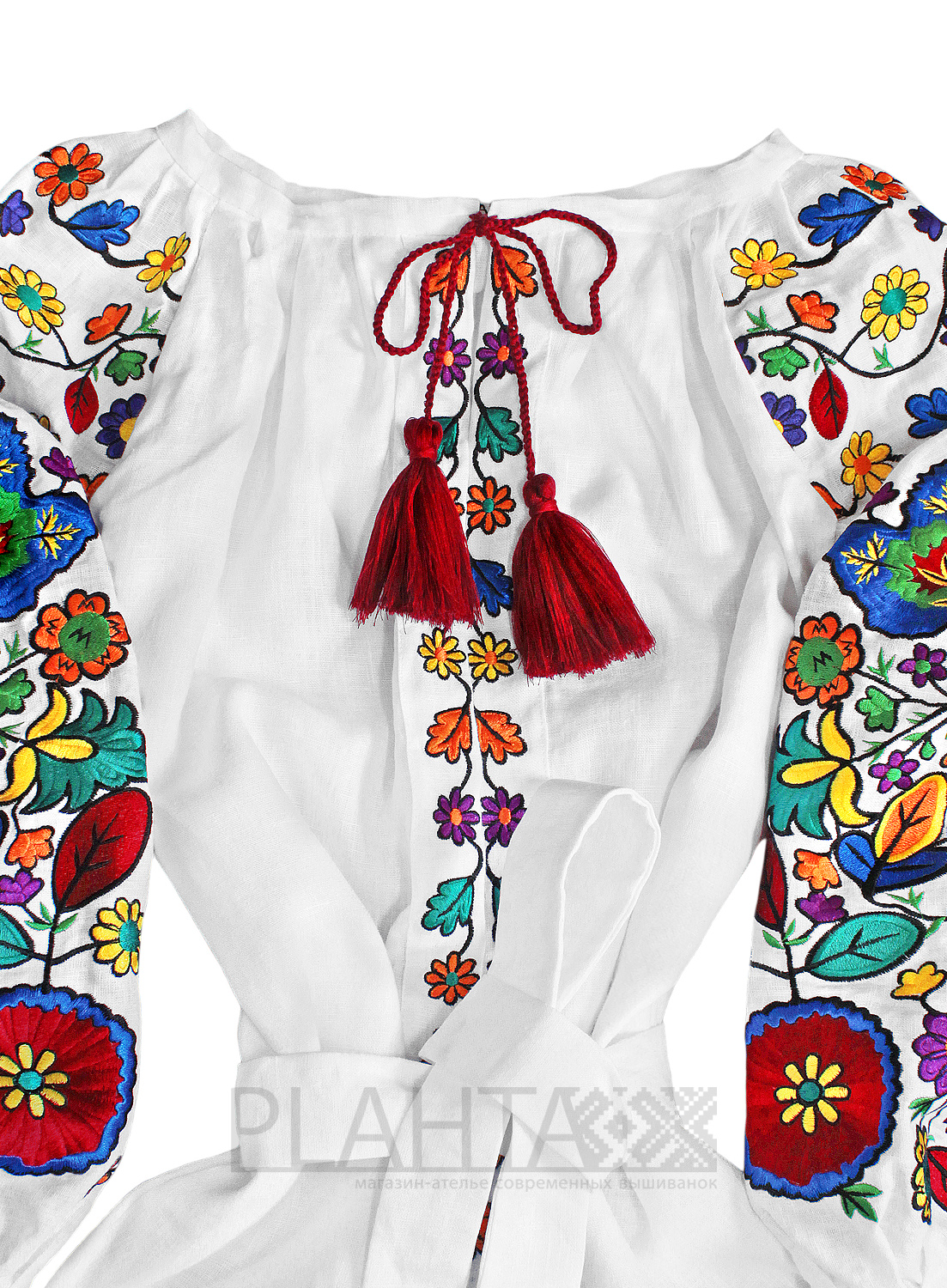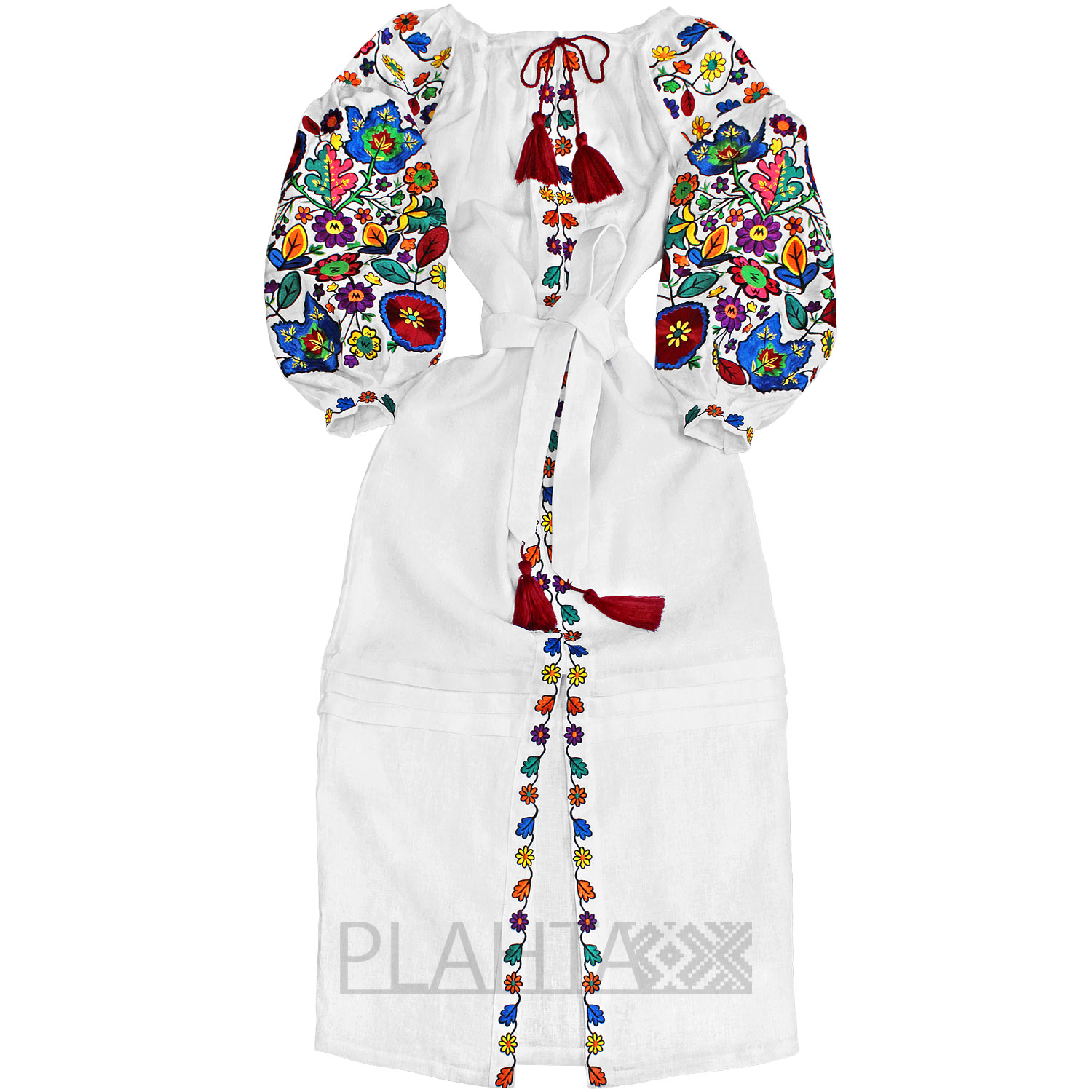 Довжина сукні - 130 см. На планці - застібки-кнопки. Горловина і рукава виконані в традиційних українських техніках - "збиранка" та "пухлики". На рукавах - гудзики-застібки. Вишивка зроблена на промислових японських вишивальних машинах якісними нитками, що не линяють. Виріб зшитий вручну нашими майстринями.