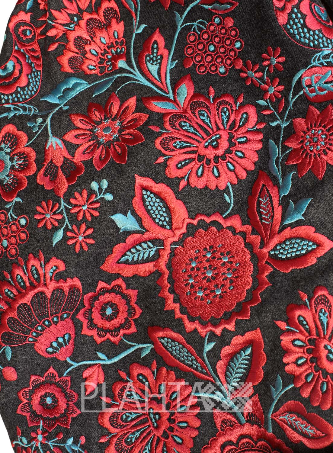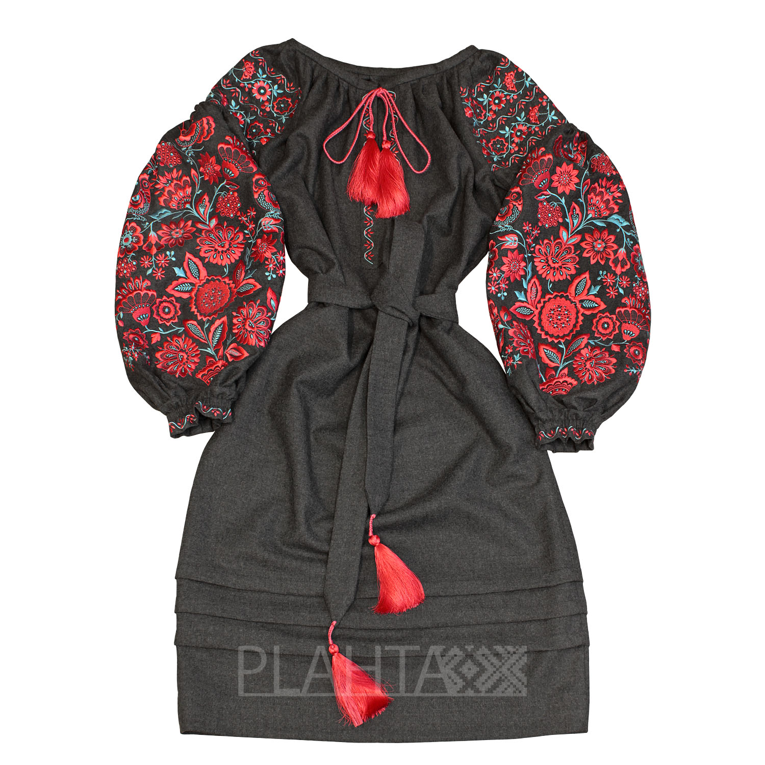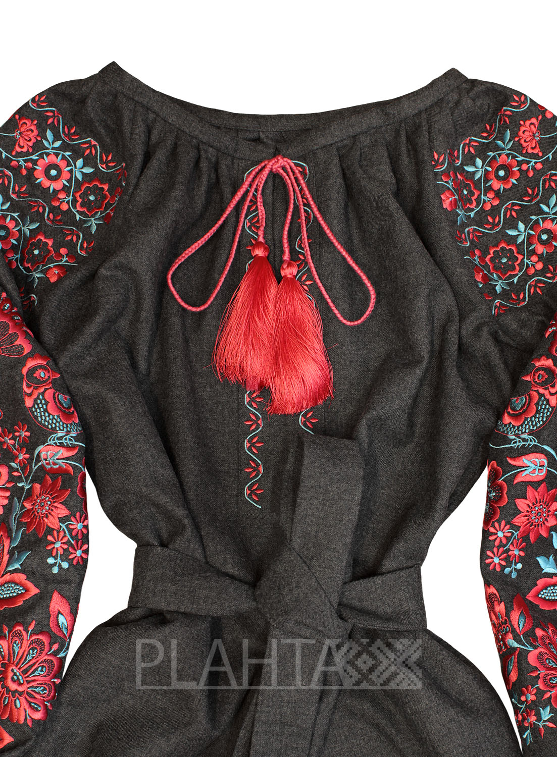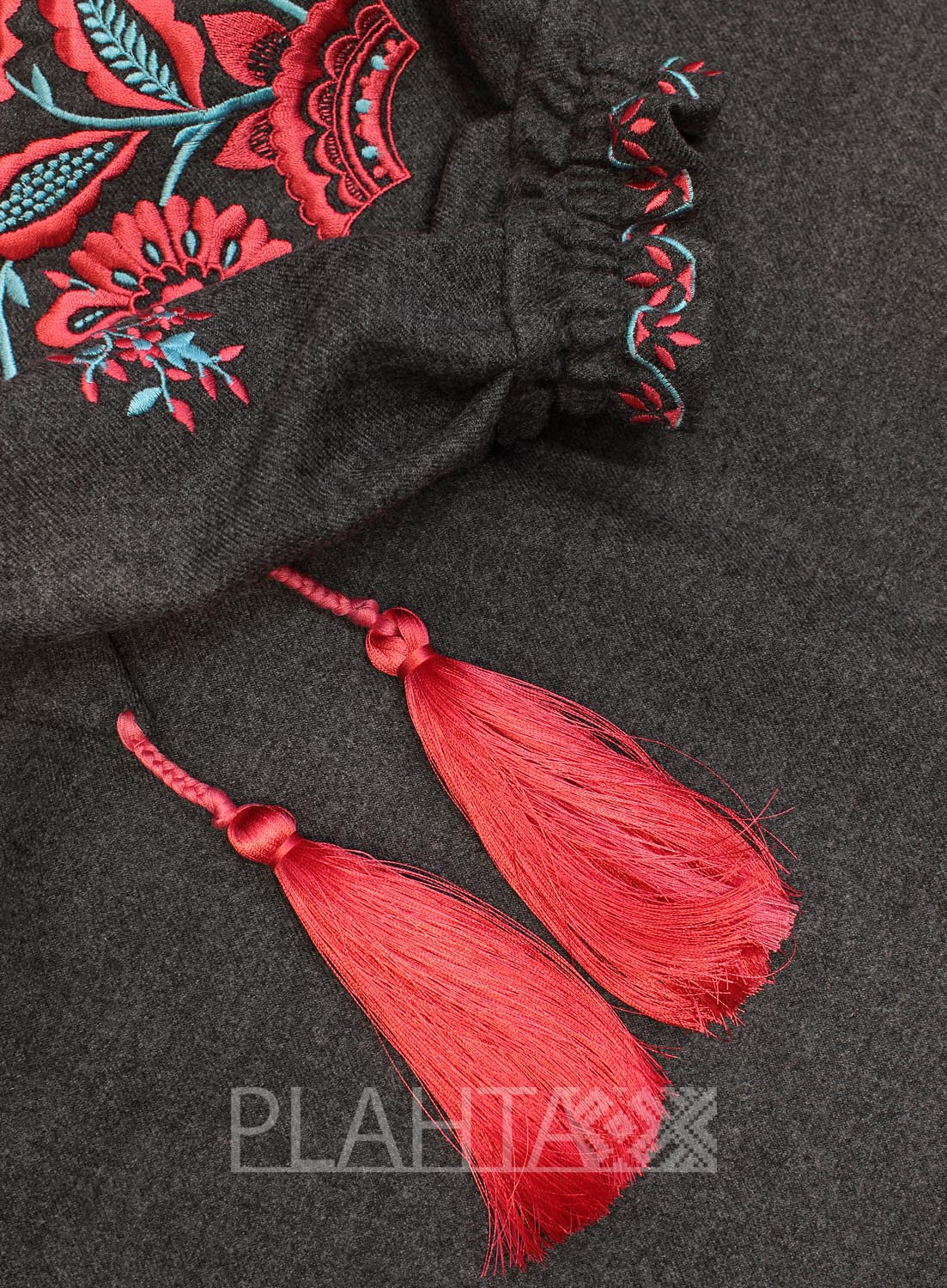 Поєднання сірої вовняної тканини та коралово-лазурової вишивки виглядає дуже жіночно. На окрему увагу заслуговує мотив "Дерево Життя", використаний у вишивці. Це  український етнічний обереговий знак, який має декілька значень: Мати-Природа, Жінка-Мати, уособлення структури світобудови. Квіти на Дереві Життя символізують красу і  молодість, а птиці - це посланці Божого Духа, що оберігають родину.