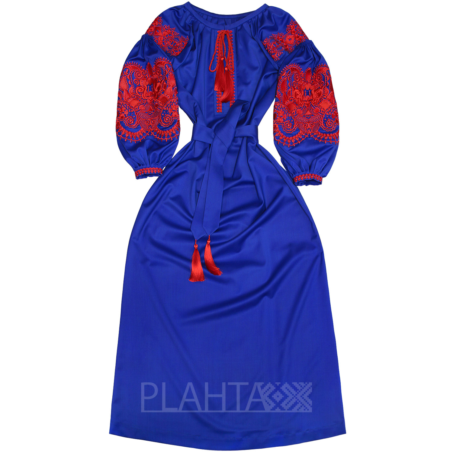 Довжина сукні - 130 см. Пошиття - цілісний фасон з вирізом посередині. Для декорування горловини і рукавів використані традиційні техніки "збиранка" та "пухлики". На рукавах - застібки-гудзики. Вишивка гладдю зроблена на промислових японських вишивальних машинах якісними нитками, що не линяють. Виріб зшитий вручну нашими майстринями.