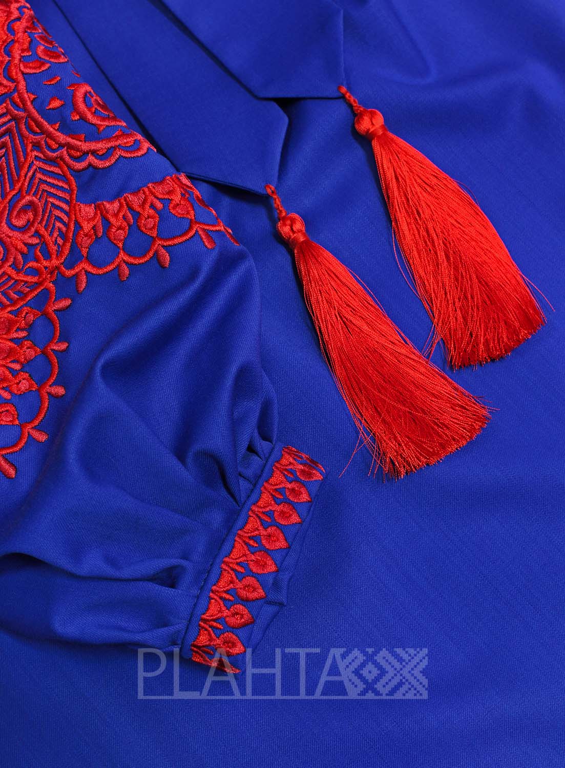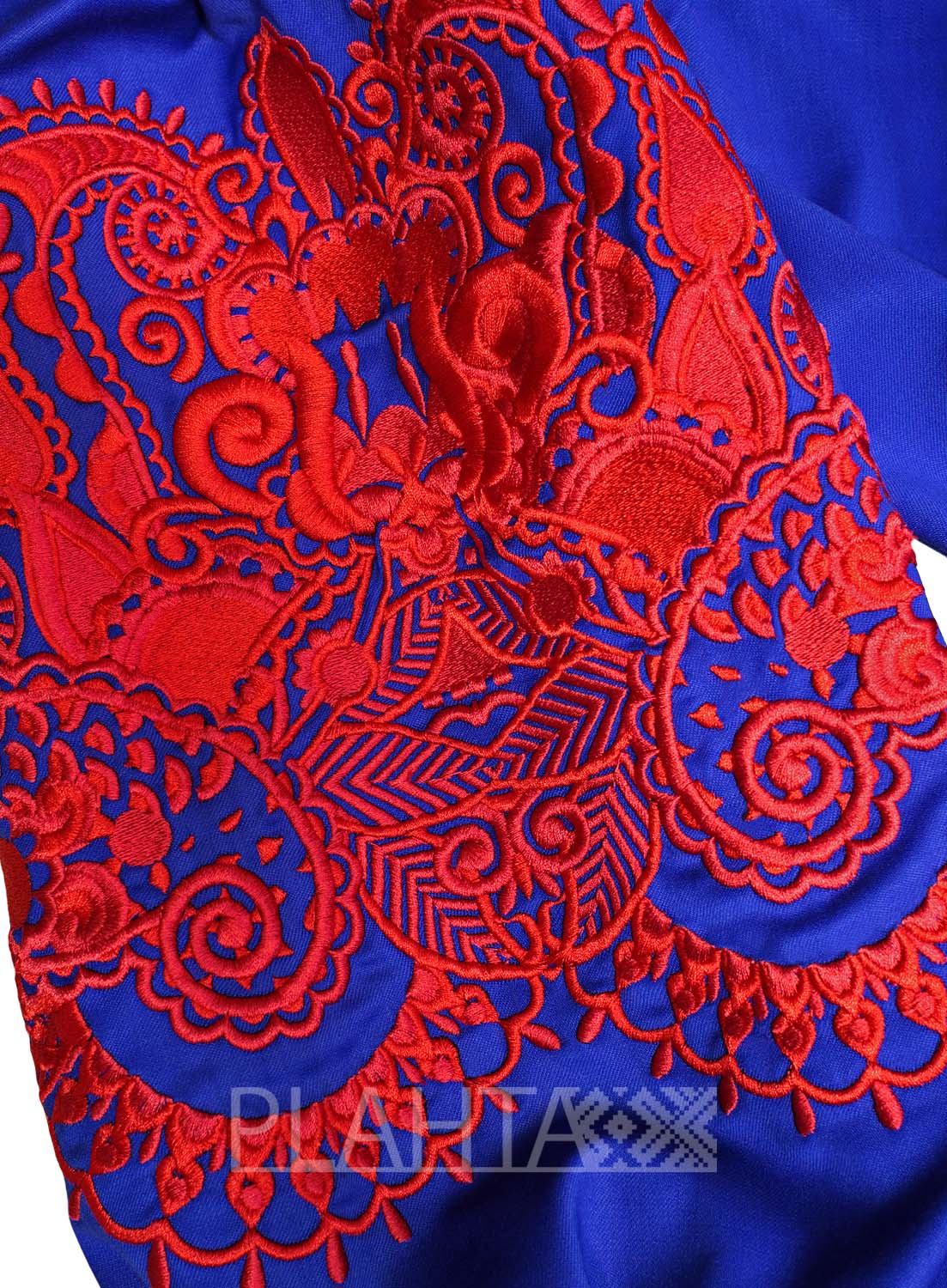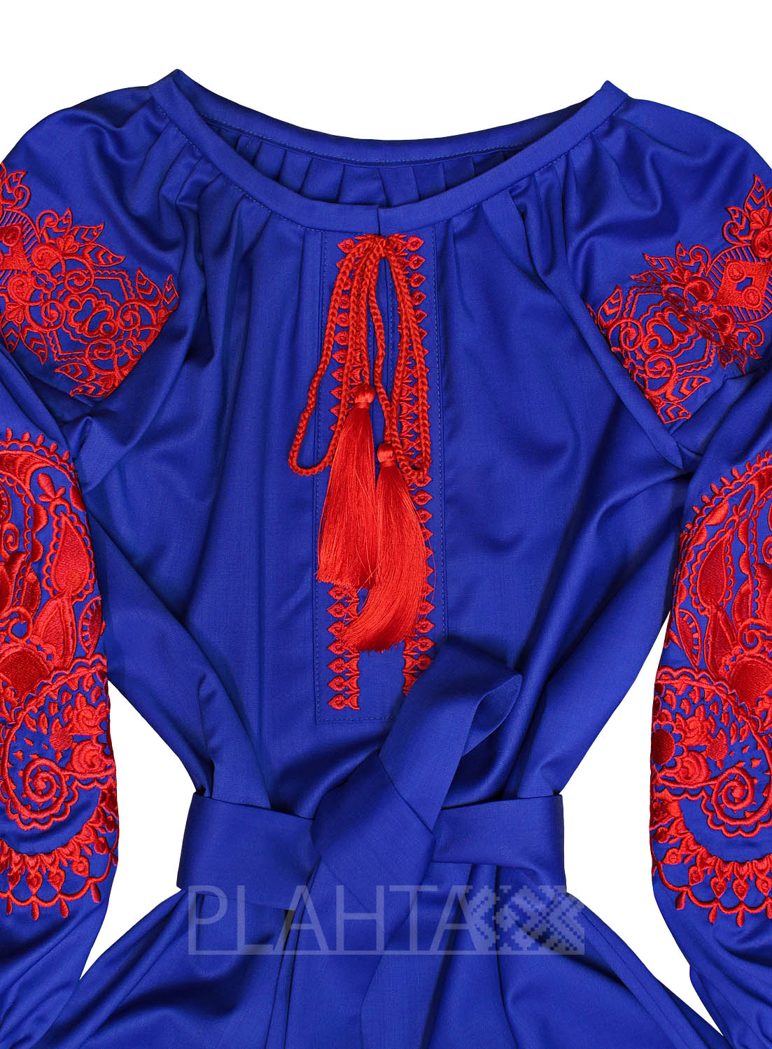 Шляхетний синій колір сукні є символом душевного спокою. Його здавна вважали наймогутнішим оберегом. Насичений червоний символізував любов, пристрасть, сонце. Цей колір захищає від зла і притягує енергію гармонії і любові. В авторській вишивці східного орнаменту простежуються елементи "Пейслі" ( "буту" на Сході), який ще називають "східний огірок". "Східний огірок" родом з Персії. Це символ руху, розвитку і енергії, який також асоціюють з побажанням щастя і благополуччя дому.