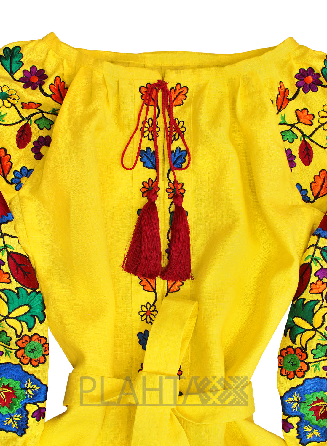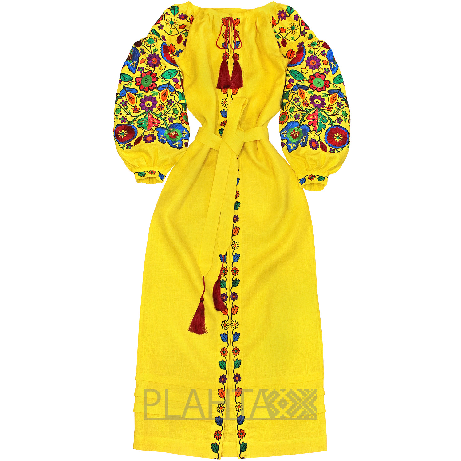 Довжина сукні - 130 см. На планці - застібки-кнопки. Горловина і рукава виконані в традиційних українських техніках - "збиранка" та "пухлики". На рукавах - гудзики-застібки. Вишивка зроблена на промислових японських вишивальних машинах якісними нитками, що не линяють. Виріб зшитий вручну нашими майстринями.