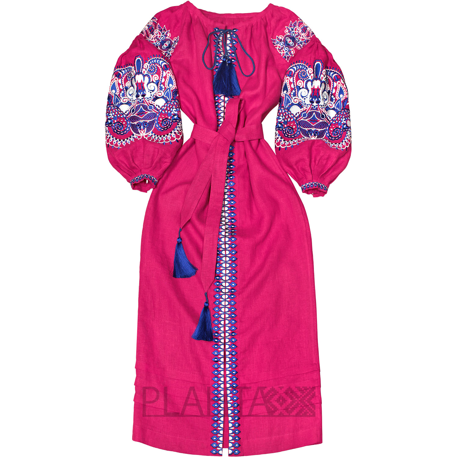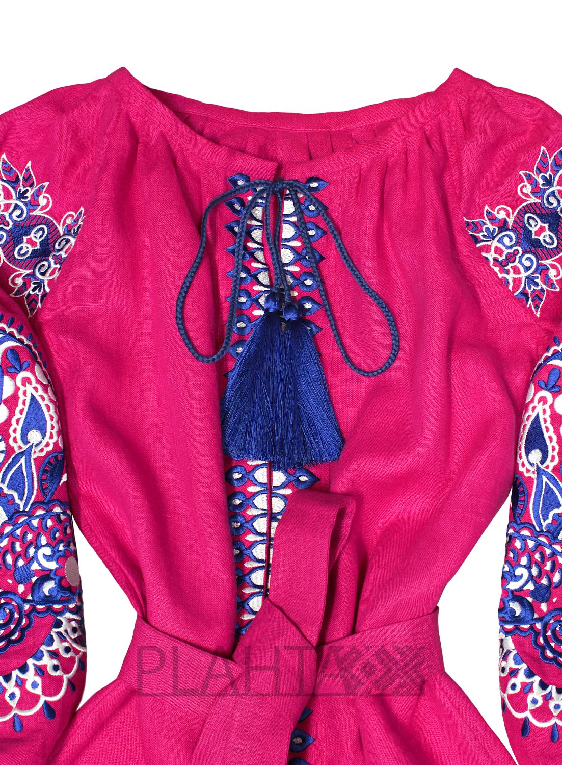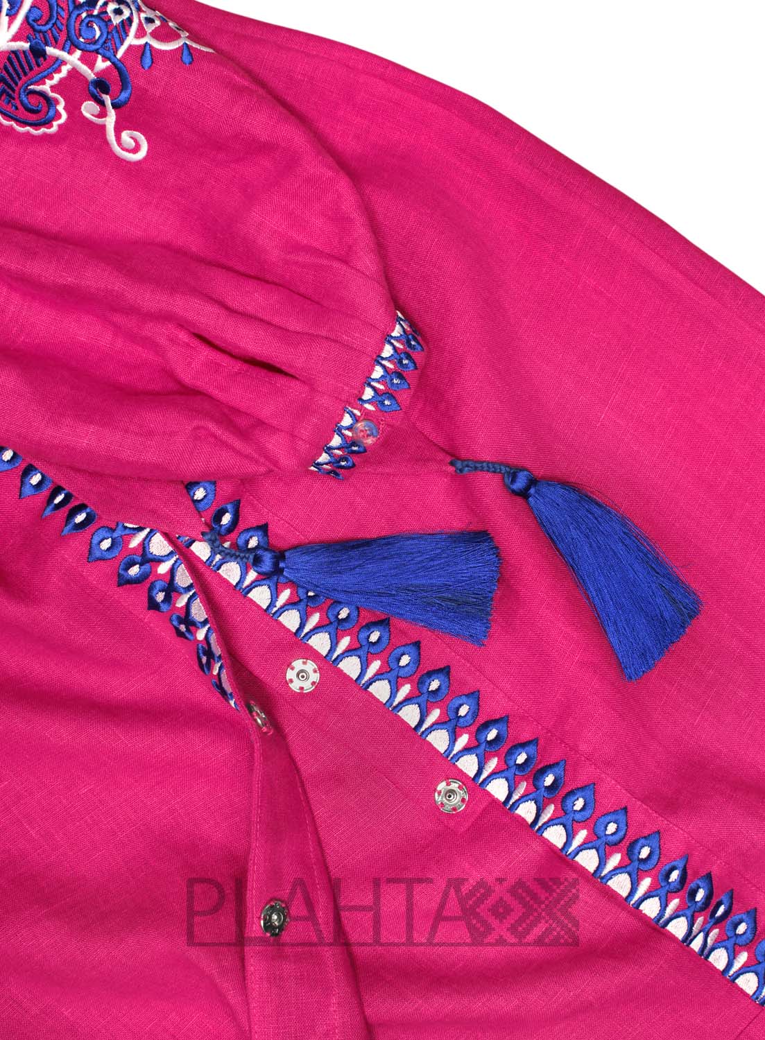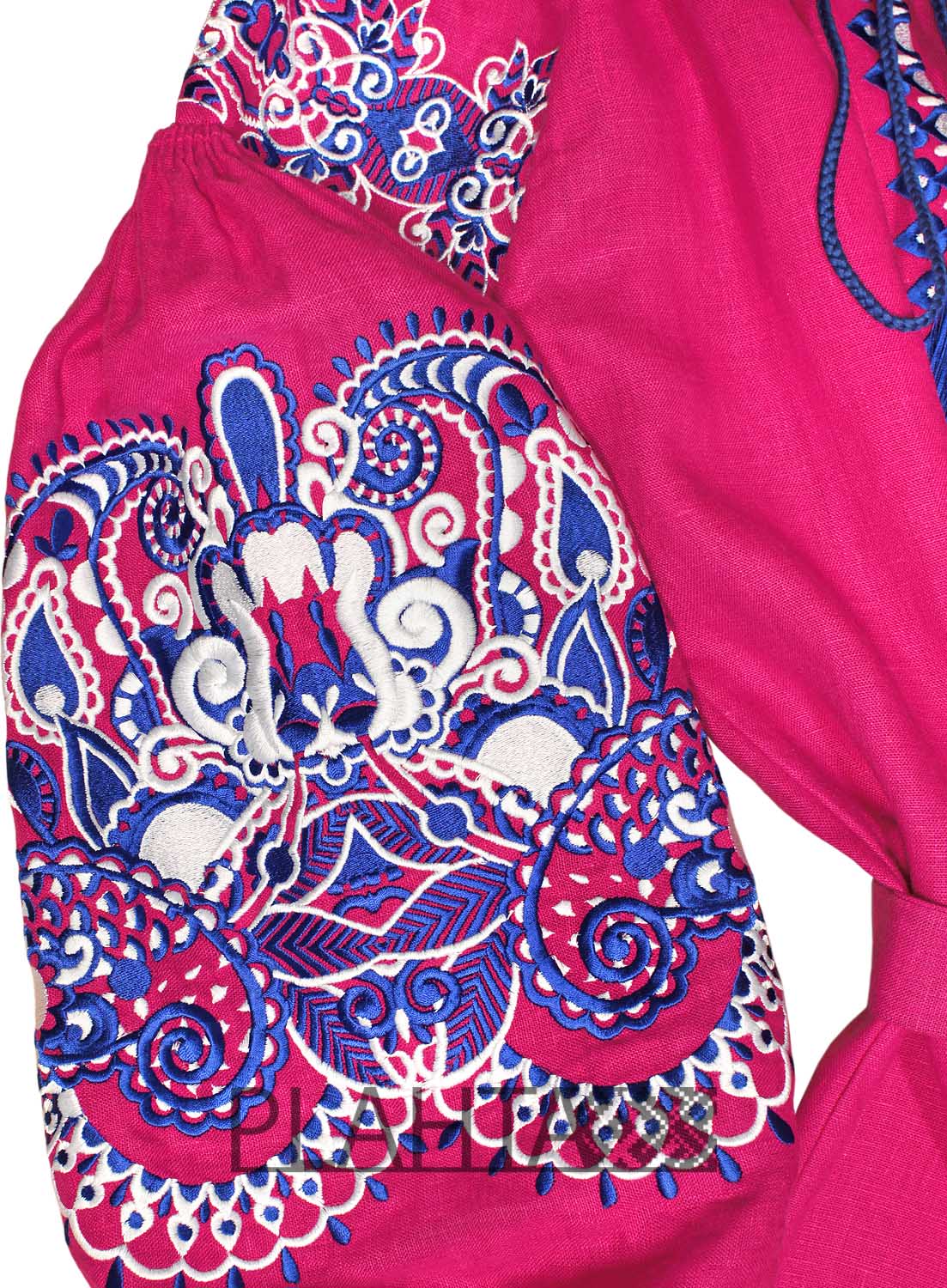 На соковитому малиновому льоні красується біло-синя вишивка. Білий колір - символ чистоти, світла й енергії. А синій колір в українській культурі здавна вважали наймогутнішим оберегом. В авторській вишивці східного орнаменту простежуються елементи "Пейслі" ( "буту" на Сході), який ще називають "східний огірок". "Східний огірок" родом з Персії. Це символ руху, розвитку і енергії, який також асоціюють з побажанням щастя і благополуччя дому.