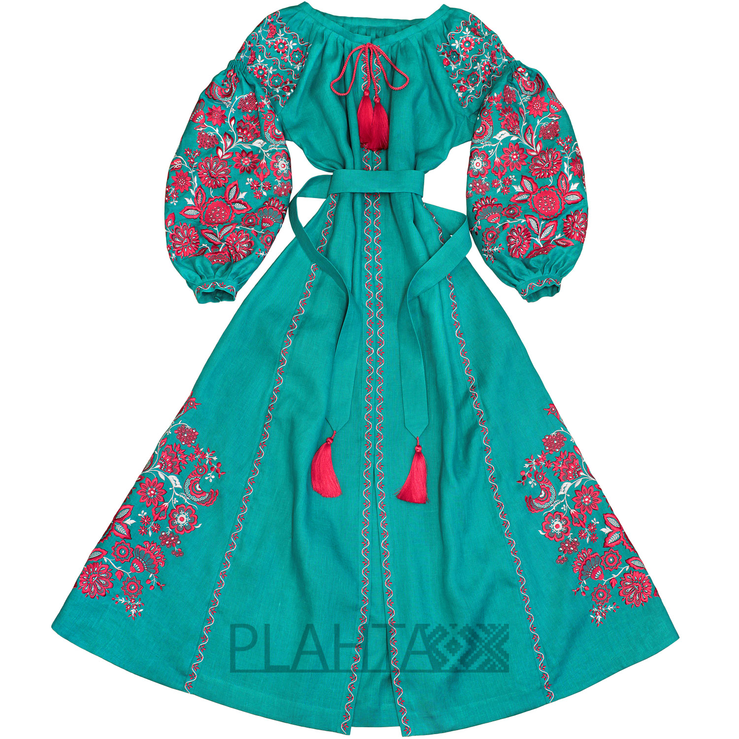 Довжина - 130 см. З боків сукні - клини, прикрашені вишивкою. На планці - застібки-кнопки. Горловина і рукава декоровані в традиційних українських техніках - "збиранка" та "пухлики". На рукавах - застібки-гудзики. Вишивка зроблена на промислових японських вишивальних машинах якісними нитками, що не линяють. Виріб зшитий вручну нашими майстринями.