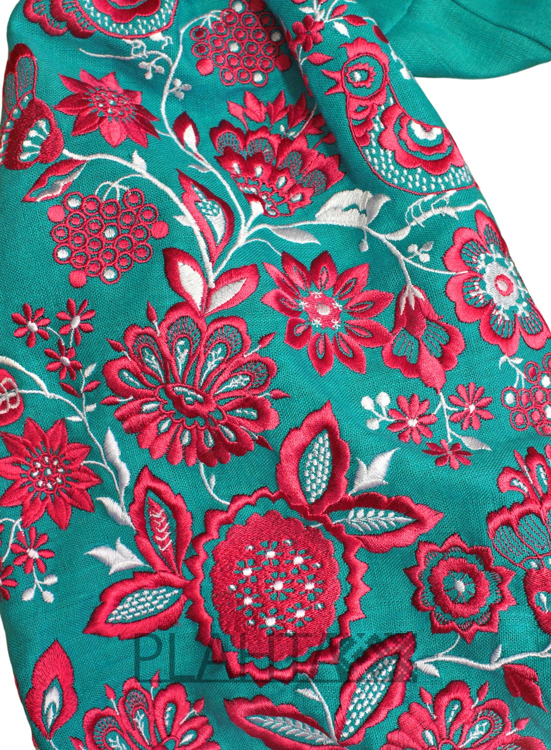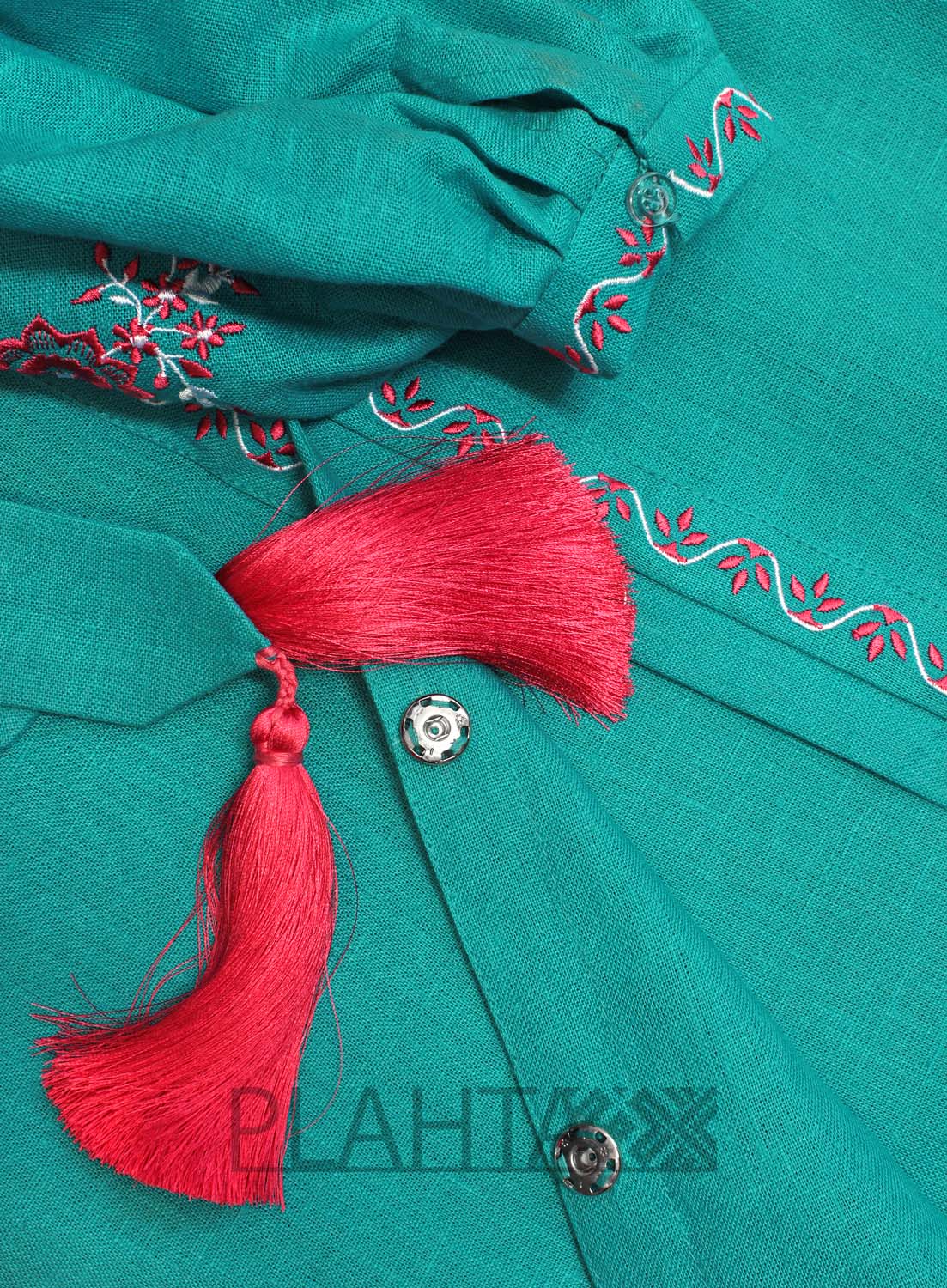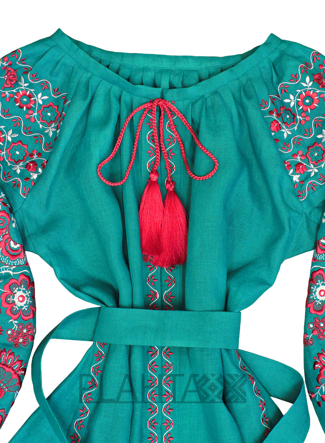 З бірюзовим кольором льону чудово гармонує біло-рожева вишивка, що несе глибинний архаїчний зміст. Так зване, "Дерево Життя" - це український етнічний обереговий знак, який має декілька значень: Мати-Природа, Жінка-Мати, уособлення структури світобудови. Квіти на Дереві Життя символізують красу і молодість, а птиці - це посланці Божого Духа, що оберігають родину.