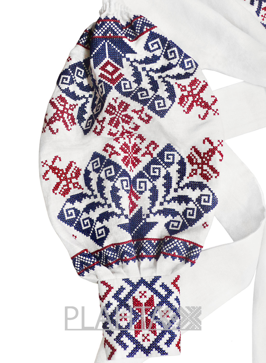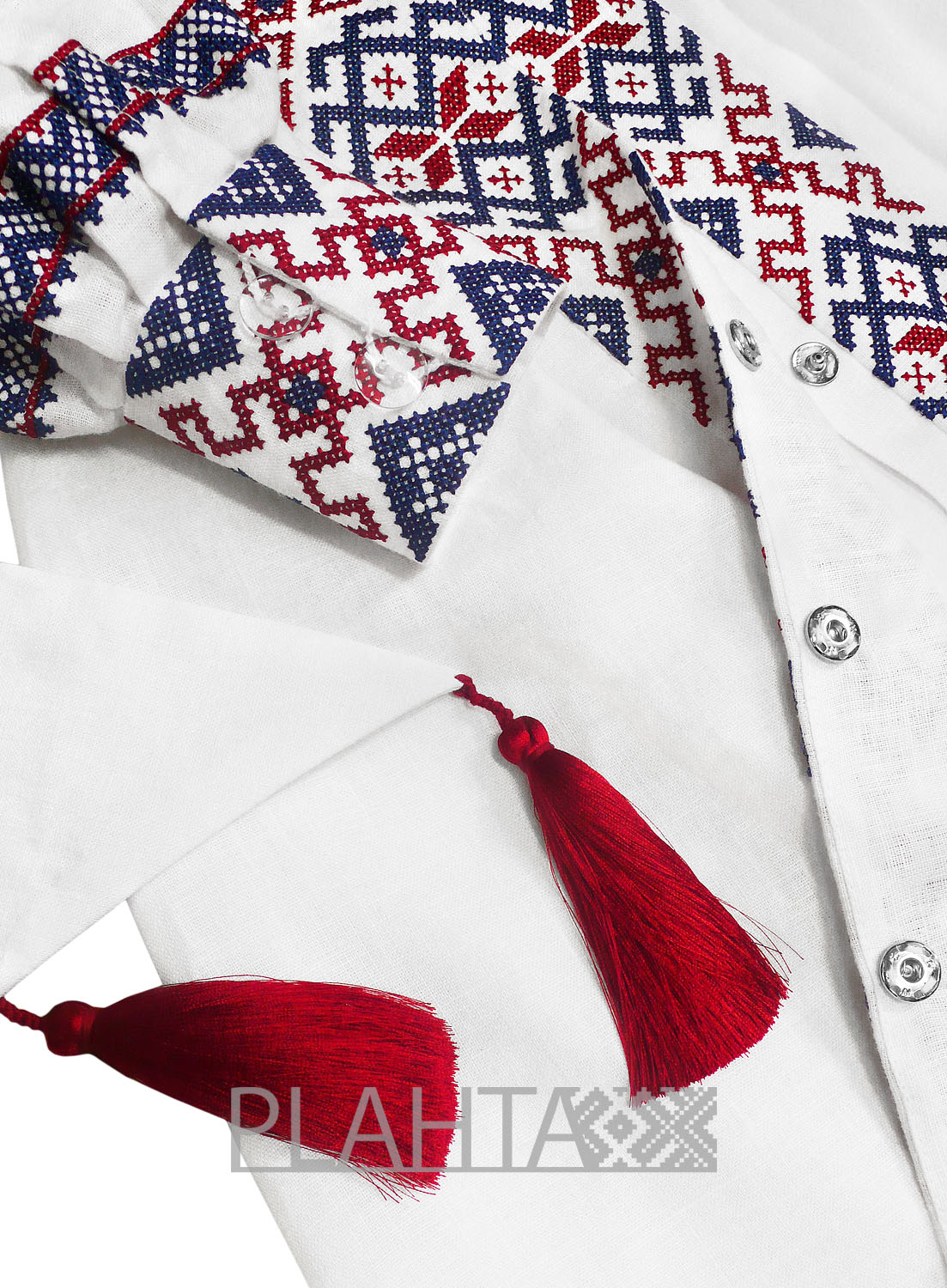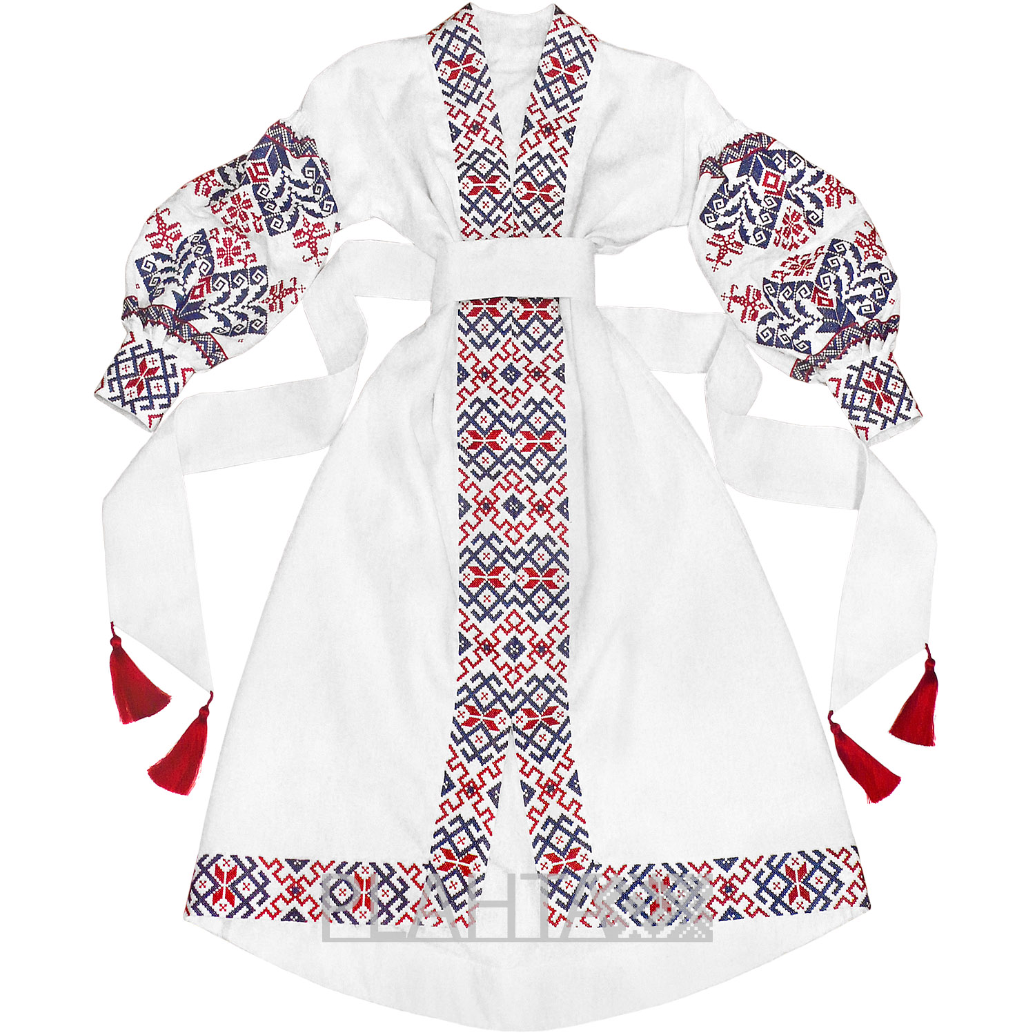 Довжина - 130 см. На планці - застібки-кнопки. Рукава виконані в традиційній українській техніці "пухлики". На рукавах - застібки-гудзики. Вишивка хрестиком зроблена на  промислових японських вишивальних машинах якісними нитками, що не линяють. Виріб зшитий вручну нашими майстринями.