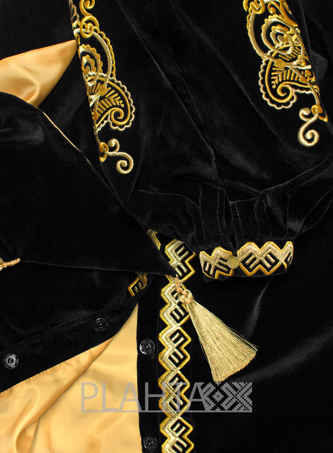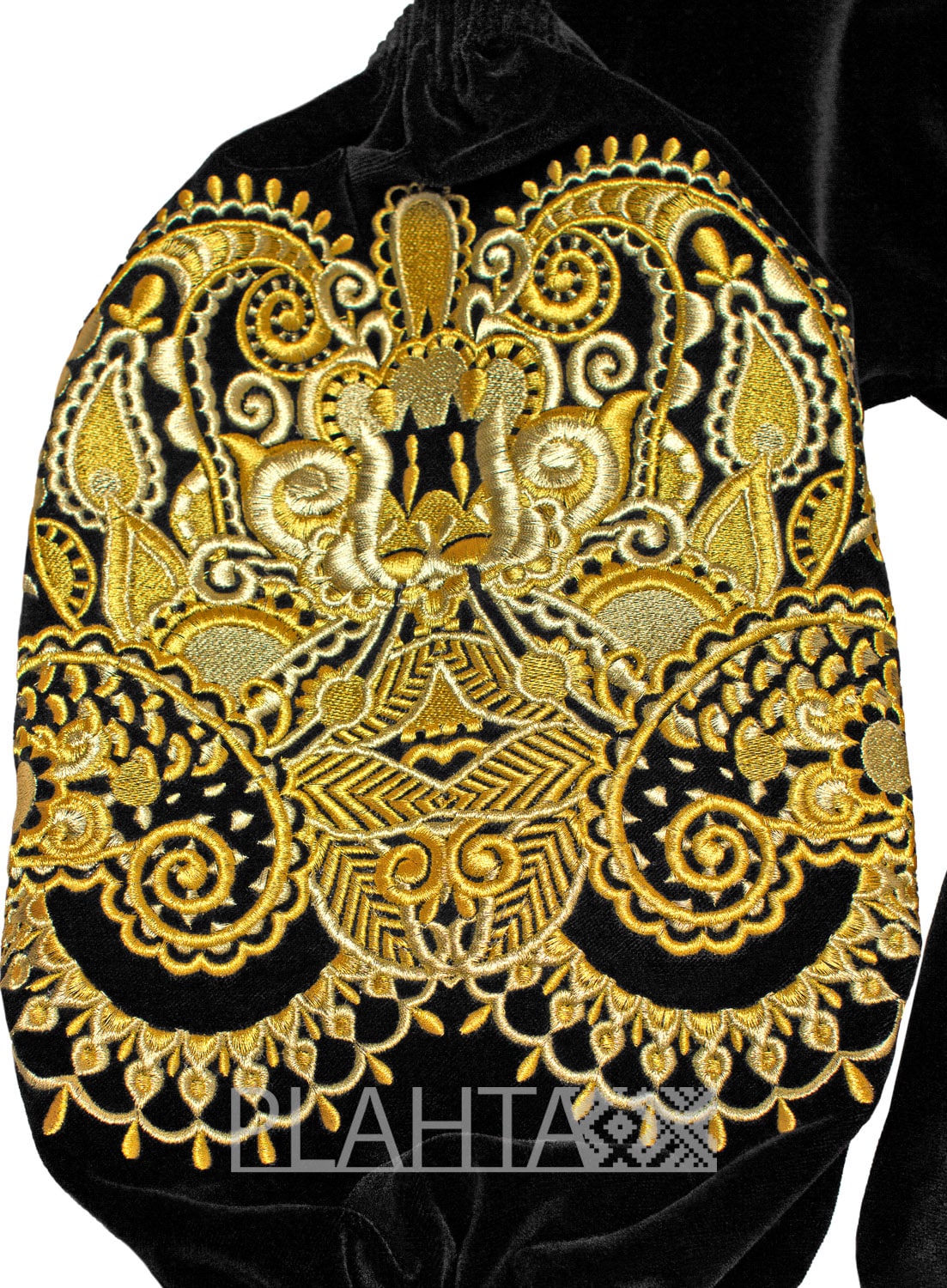 Глибокий чорний колір і розкішні золоті тони не тільки чудово гармонують один з одним, але й символізують багатство та благополуччя. А в авторській вишивці східного орнаменту простежуються елементи "Пейслі" ( "буту" на Сході), який ще називають "східний огірок". "Східний огірок" родом з Персії. Це символ руху, розвитку і енергії, який також асоціюють з побажанням щастя і благополуччя дому.