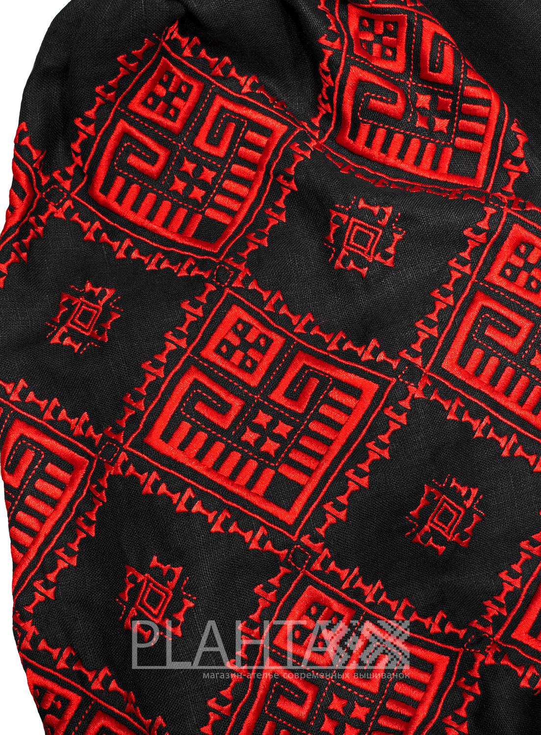 У колориті і вишитому орнаменті укладений глибокий архаїчний символізм. Так чорний колір символізує родючість, а червоний - пристрасть, любов, енергію сонця. З давніх-давен вважалося, що червоний колір захищає від зла і притягує енергію гармонії, творіння, любові. У вишивці використані давньослов'янські сакральні символи. Домінує ромбічний мотив, який є потужним оберегом, що приносить щастя. Ромб - це символ сонця і родючості, ромб з крапкою посередині позначає запліднення, а перехрещений ромб - це засіяна нива. Також у вишивці зустрічається трикутник - символ людини.