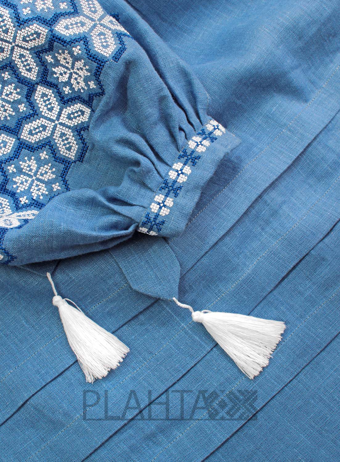 Довжина - 94см. Пошиття - цілісний фасон з вирізом посередині. На горловині та рукавах використані автентичні українські техніки декорування - "збиранка" та "пухлики". На рукавах - застібки-гудзики. Вишивка хрестиком зроблена на промислових японських вишивальних машинах якісними нитками, що не линяють. Виріб зшитий вручну нашими майстринями.