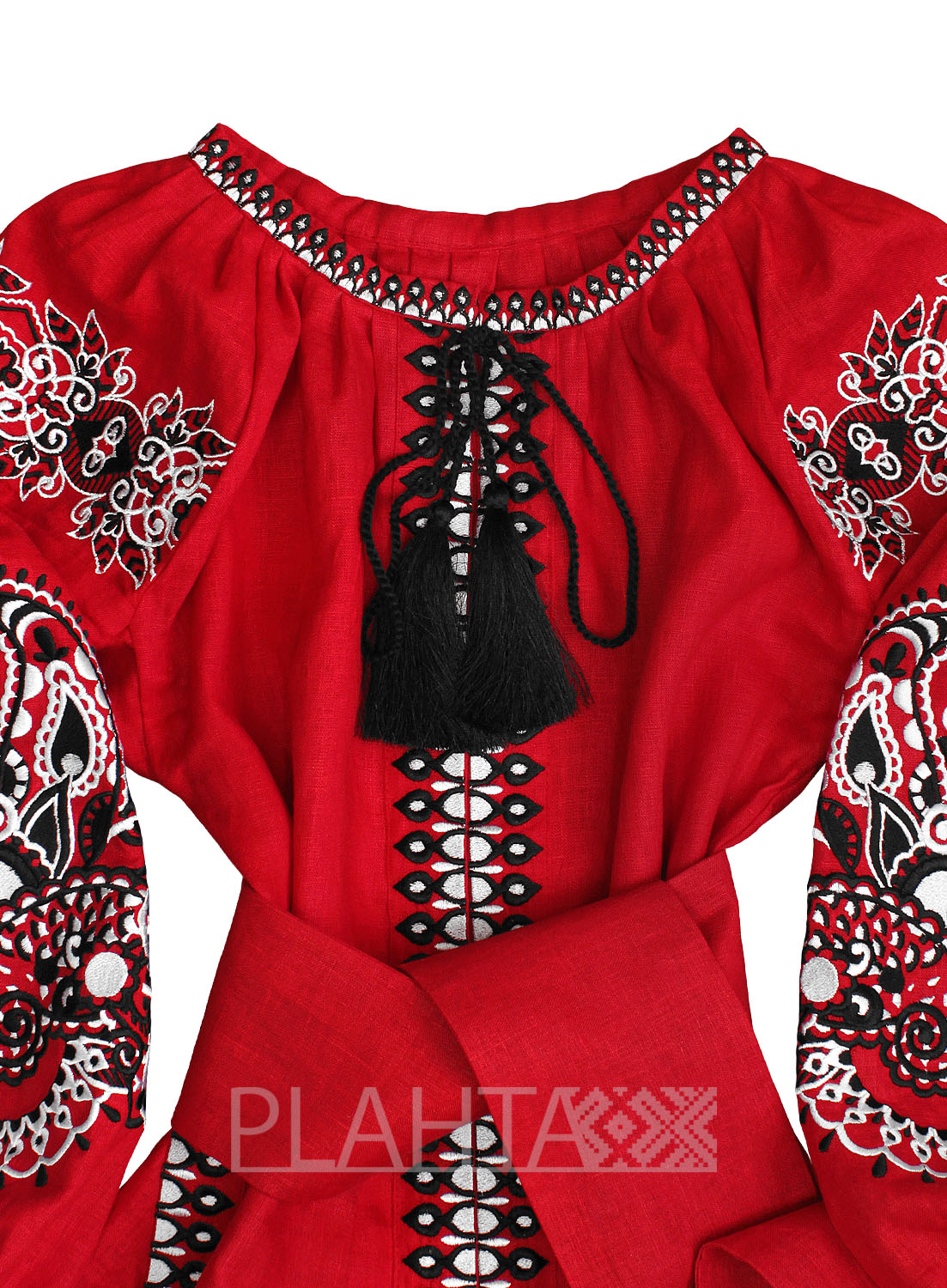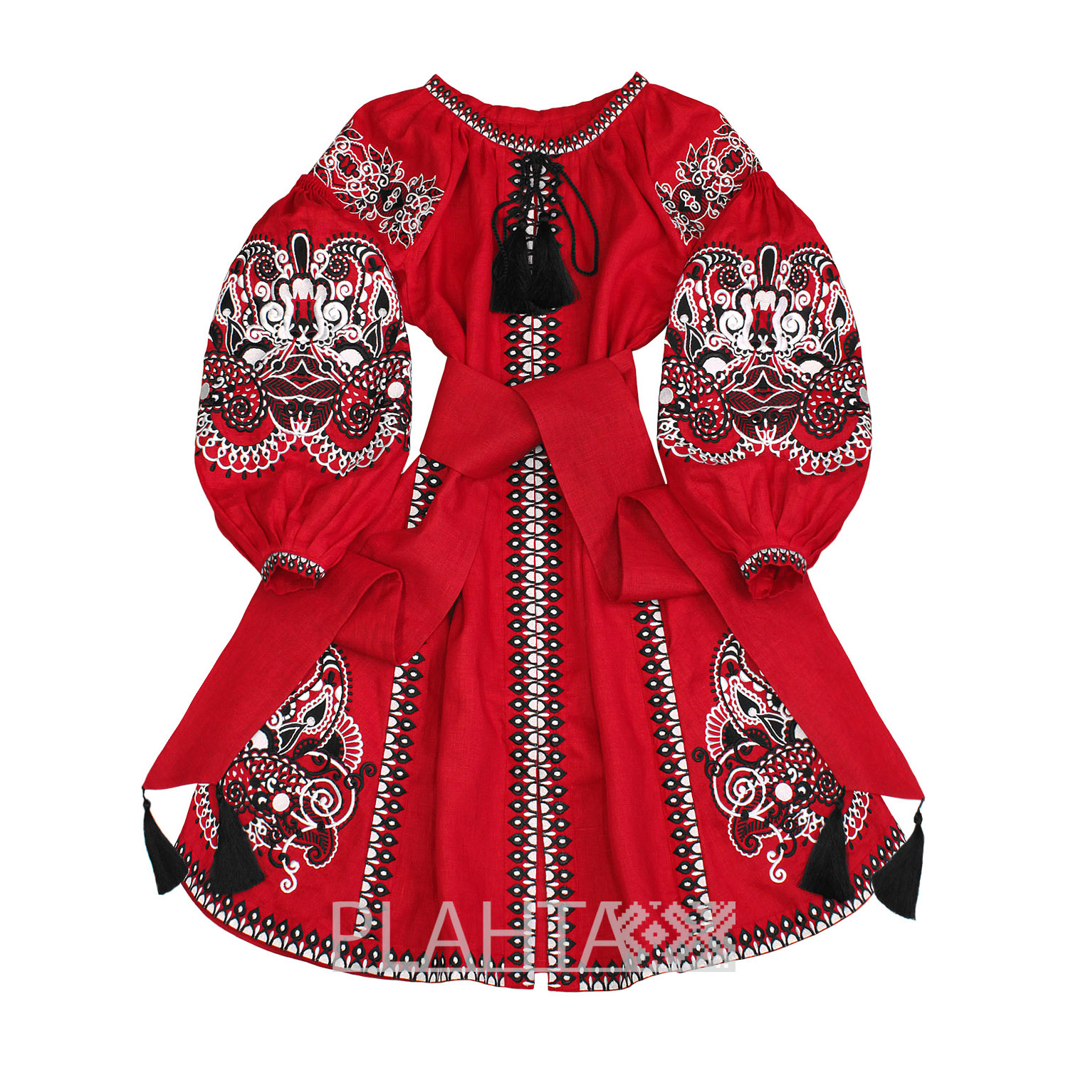 Довжина сукні - 100 см. З боків сукні - клини, прикрашені вишивкою. На планці - застібки-кнопки. Горловина і рукава декоровані в традиційних українських техніках - "збиранка" та "пухлики". На рукавах - застібки-гудзики. Вишивка зроблена на промислових японських вишивальних машинах якісними нитками, що не линяють. Виріб зшитий вручну нашими майстринями.