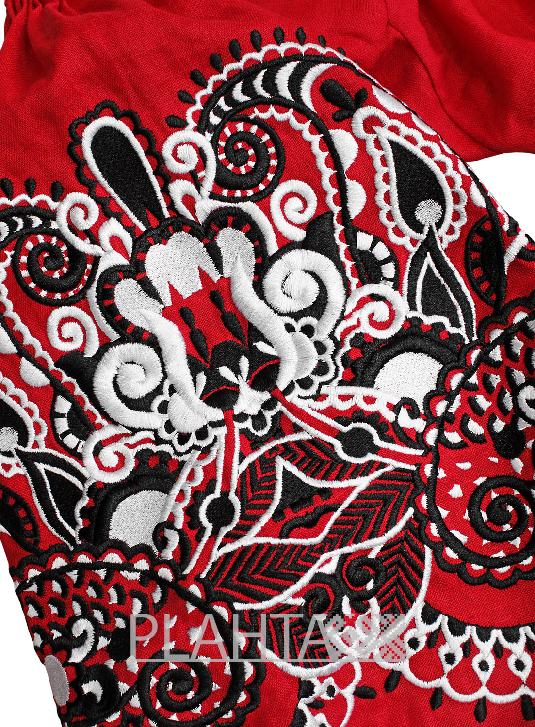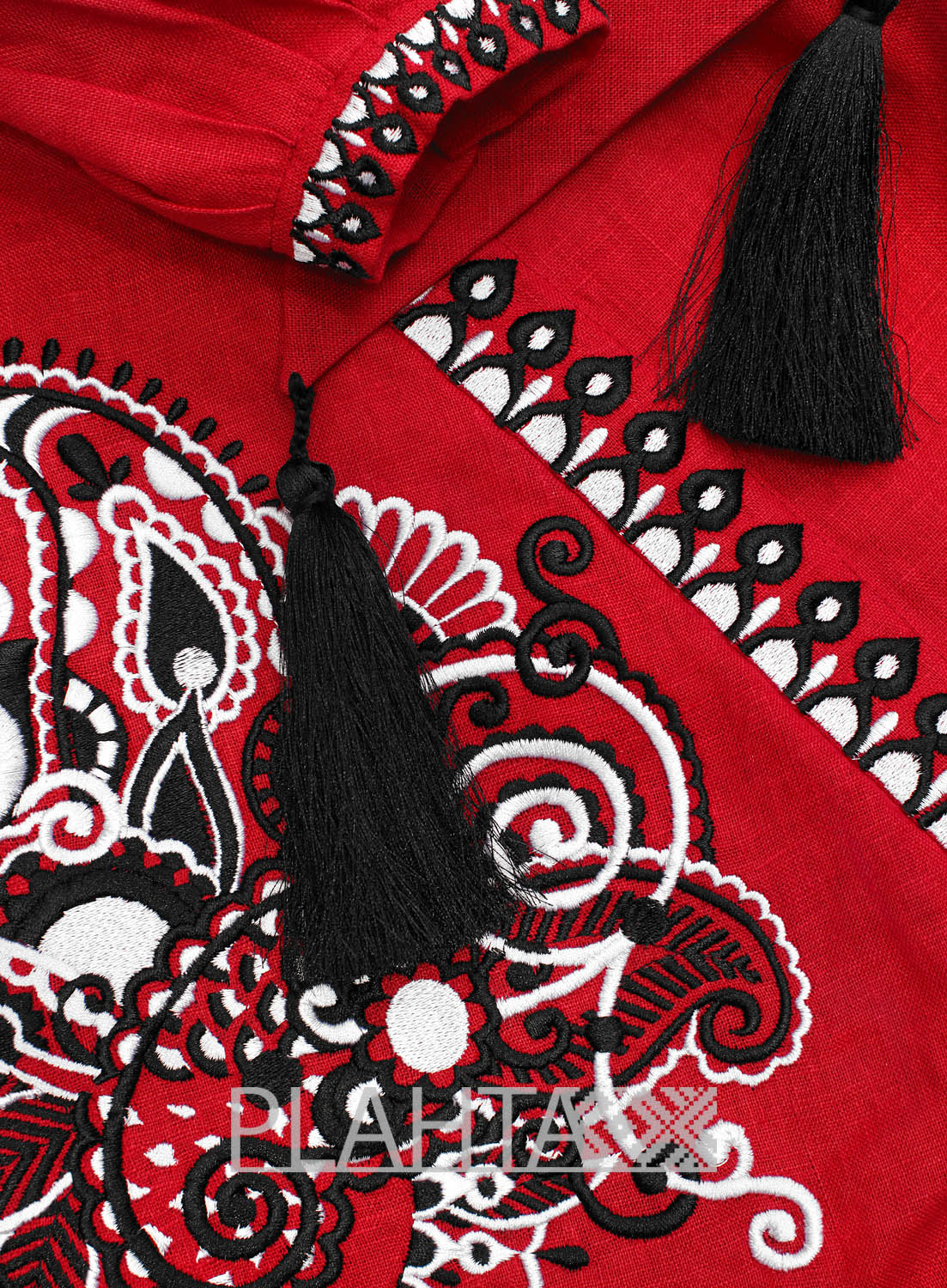 Насичений червоний колір сукні є символом любові, пристрасті та сонця. Білий колір вишивки символізує чистоту та енергію, а чорний - родючість. В авторській вишивці східного орнаменту простежуються елементи "Пейслі" ( "буту" на Сході), який ще називають "східний огірок". "Східний огірок" родом з Персії. Це символ руху, розвитку і енергії, який також асоціюють з побажанням щастя і благополуччя дому.