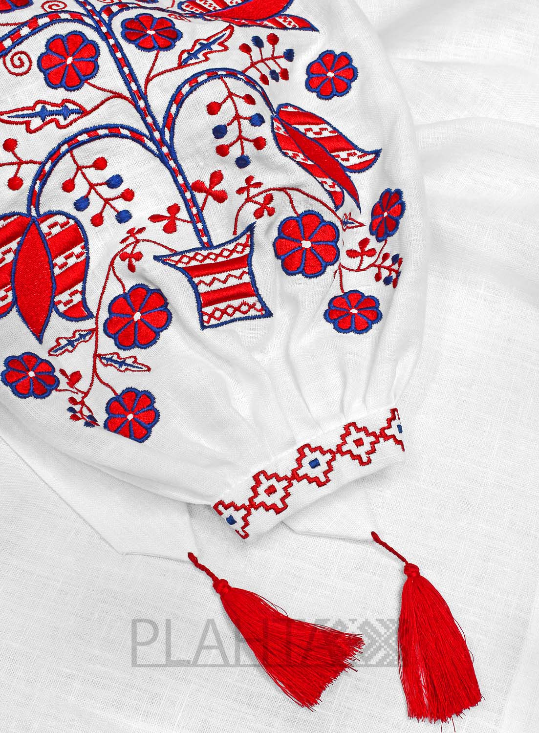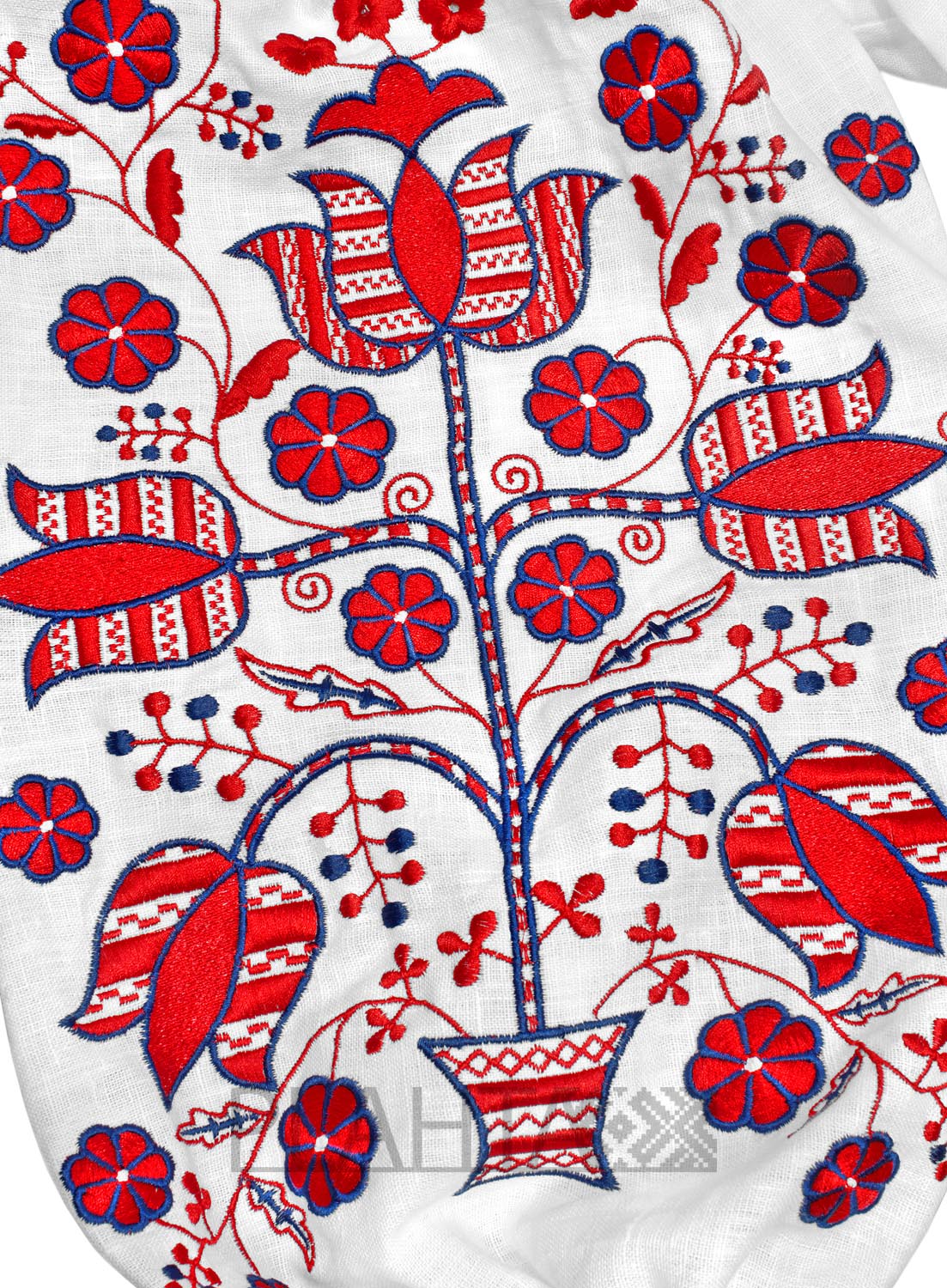 У вишиванці використаний традиційний український колорит - червоно-синій орнамент на білому льоні. Білий колір - символ чистоти і невинності, також це колір енергії. Синій - це колір води, він символізує очищення, душевний спокій, а також жіноче начало. Насичений червоний, в свою чергу, активно захищає від зла і притягує енергію гармонії, творіння, любові. Таке поєднання кольорів трактується як контраст між енергією і спокоєм. Вишивка в червоних тонах з використанням квіткових мотивів здавна вважалася оберегом любові. Домінуючий мотив у вишивці, використаний для декорування рукавів, - "Дерево Життя" - один з найдавніших символів, що втілює зв'язок землі з небом. До того ж, за народними уявленнями, цей символ приносить щастя і захищає від усякого зла. Квіти на Дереві Життя символізують красу і молодість, а птиці - душу людини.