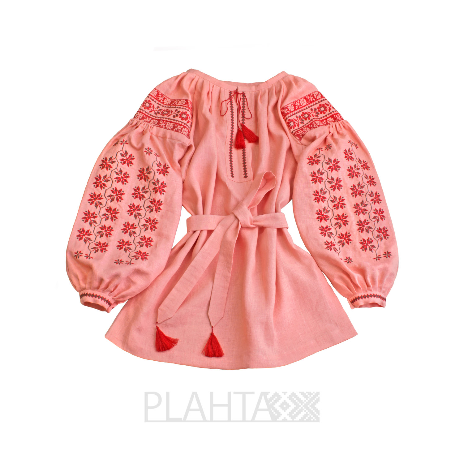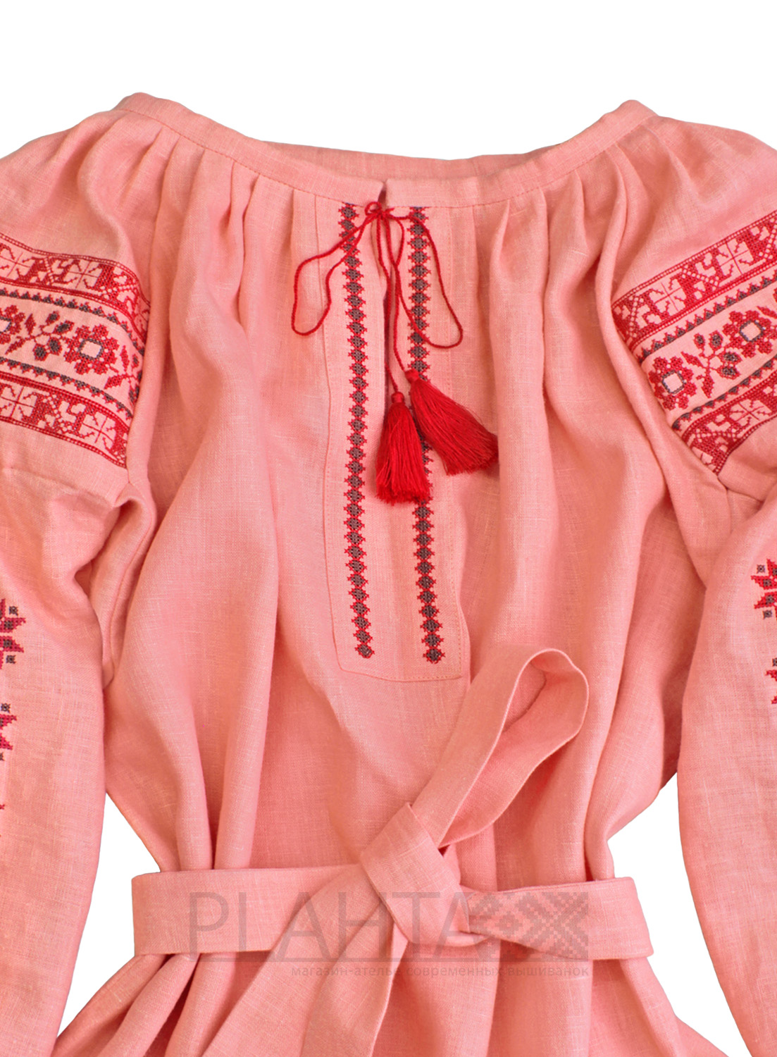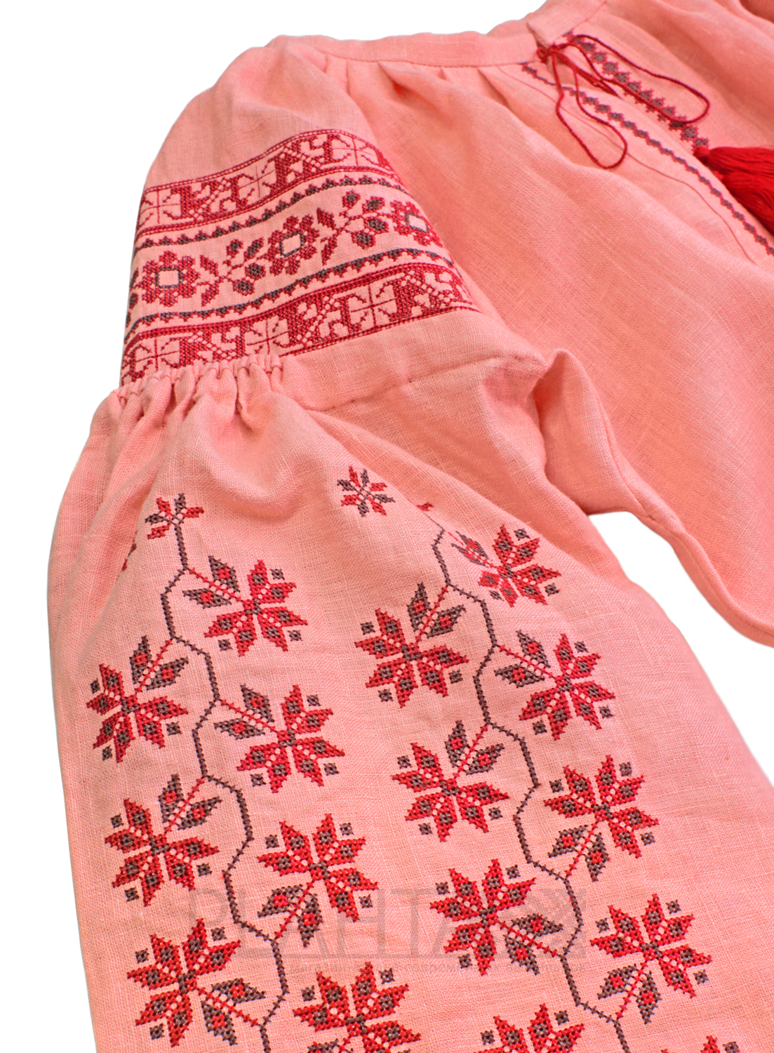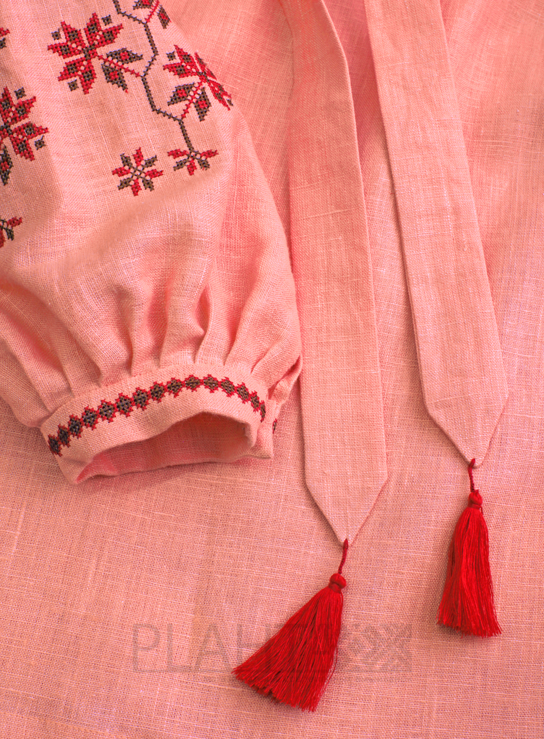 Приємне поєднання кольору коралової лляної матерії з червоно-коричневої вишивкою хрестиком має своє трактування і йде корінням в далекі архаїчні часи. Кораловий - ніжний і чуттєвий колір, колір дівочої краси. На тлі пастельного льону чітко контрастує червоно-коричневий квітково-рослинний мотив. Червоні нитки на вишиванках символізували любов, сонце, радість. Наші предки вважали, що червоний колір є джерелом позитивної енергії. Коричневий колір у вишивці, як і чорний, символізував родючість, так як це колір землі-годувальниці. Вишиті орнаменти також мають свій зміст. Квіти на плечах вишиванки - символ земної любові, сексуальної привабливості. Також, квіти, як елемент орнаменту, означають замкнуте сонячне коло і безперервне оновлення, переродження в природі. Мотив хмелю, використаний у вишивці на рукавах, несе в собі знак розвитку, молодого буяння, родючості, любові і є молодіжним символом. Хміль часто зустрічається у вишивці весільних вишиванок. Це пояснюється звичаєм наших предків обсипати молоду, що йде на вінчання, хмелем.