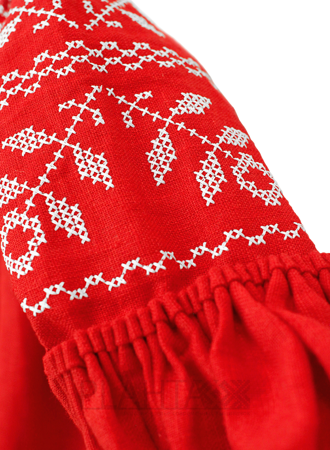 Довжина - 74 см. Пошиття - цілісний фасон з вирізом посередині. На горловині та рукавах використані традиційні українські техніки "збиранка" та "пухлики". На рукавах - застібки-гудзики. Вишивка зроблена на промислових японських вишивальних машинах якісними нитками, що не линяють. Виріб зшитий вручну нашими майстринями.