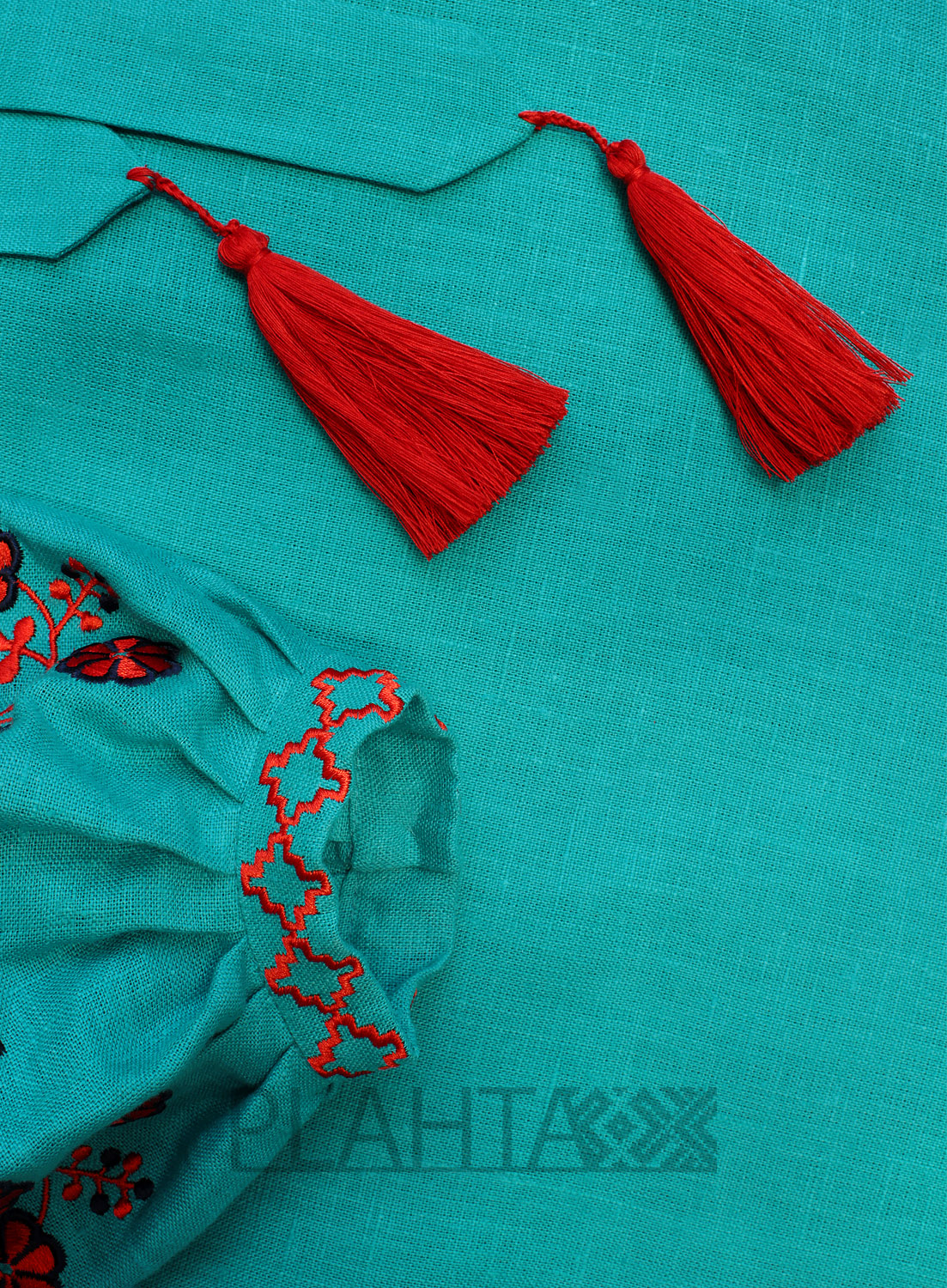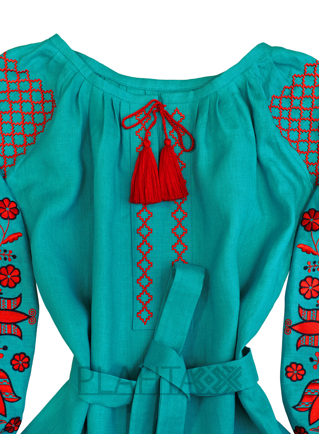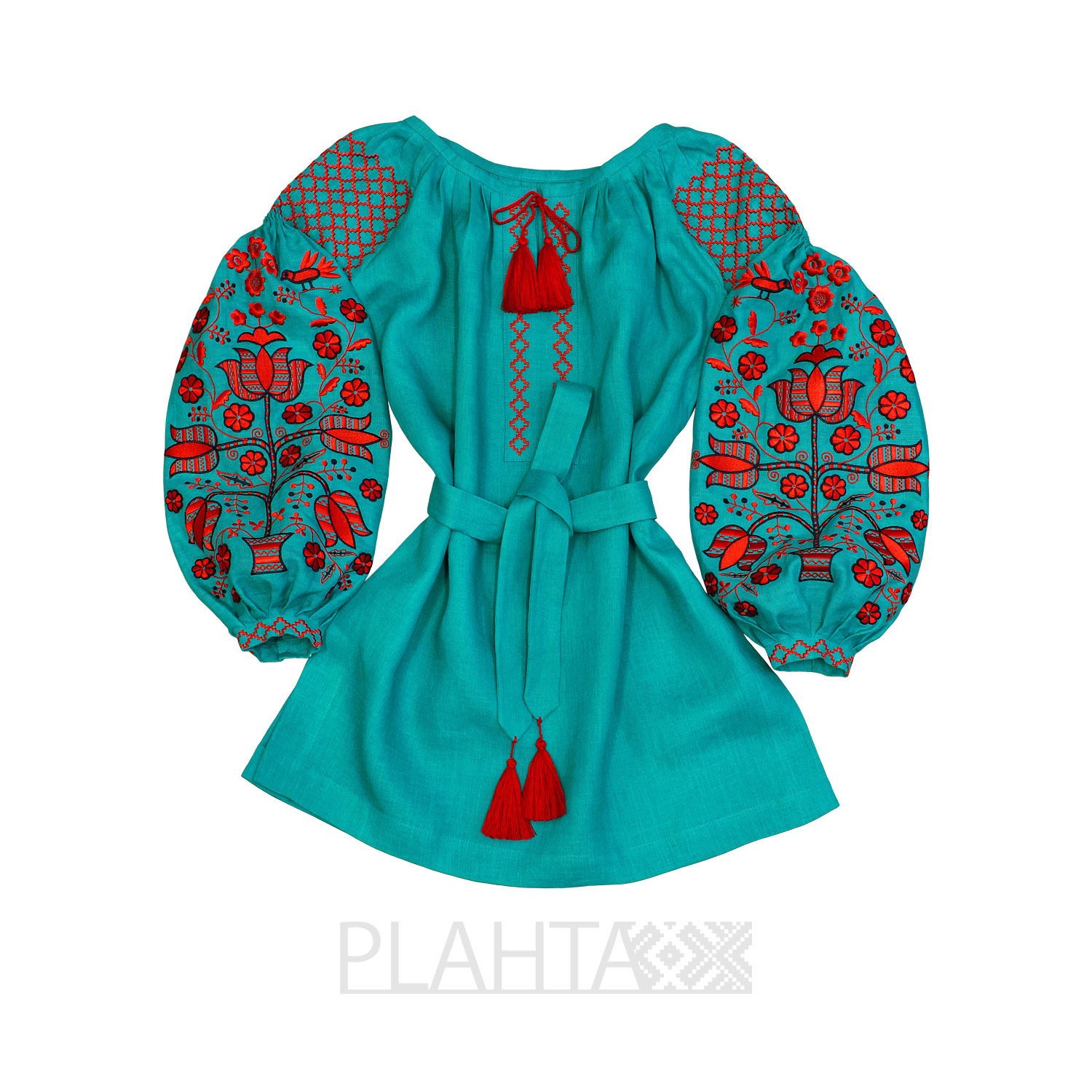 Бірюзовий колір, утворений від злиття зеленого і синього, символізує свободу, зростання, постійне оновлення і відродження в природі. Вогняний червоно-помаранчевий, в свою чергу, активно захищає від зла і притягує енергію гармонії, творіння, любові. Таке поєднання кольорів трактується як контраст між енергією і спокоєм. Вишивка в червоно-помаранчевих тонах з використанням квіткових мотивів здавна вважалася оберегом любові. Домінуючий мотив у вишивці, використаний для декорування рукавів, - "Дерево Життя" - один з найдавніших символів, що втілює зв'язок землі з небом. До того ж, за народними уявленнями, цей символ приносить щастя і захищає від усякого зла. Квіти на Дереві Життя символізують красу і молодість, а птиці - душу людини.