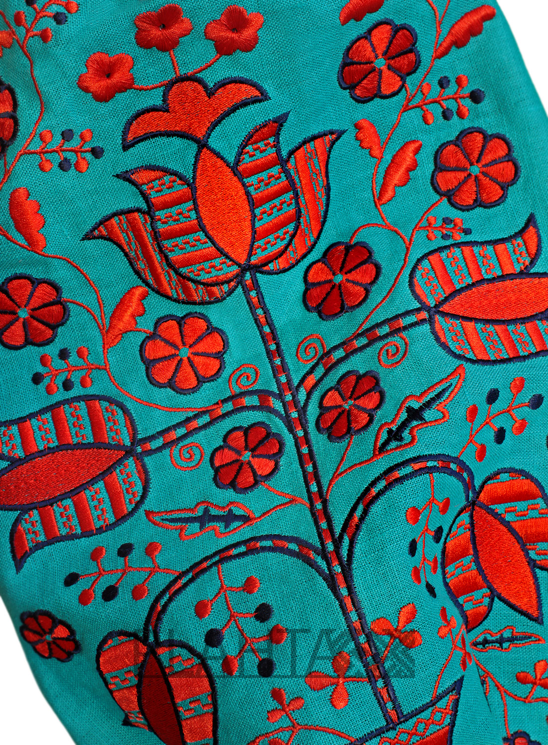 У вишиванці використані спектрально протилежні кольори - безпрограшна комбінація бірюзового та червоно-помаранчевого. Трохи нетиповий для традиційних українських вишиванок колорит по-новому розкриває цей елемент гардероба в контексті сучасного стилю.